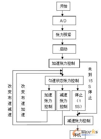 首先张力传感器的值被传送到PCC的模拟输入通道,通过模拟量转换为数字量,之后可以先进行张力预紧,使运行前各张力达到设定值的70%左右,以免全机启动后张力立即松掉。