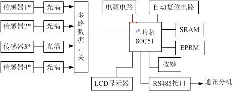 本文设计的压力测量控制系统以80C51单片机为核心,包括传感器、光耦6N139、数据开关74HC151、点阵式液晶显示模块EA-D20040AR, RS-485接口电路及高效电源电路等。测控系统接收到通讯分机传来的数据采集命令后,采集四通道的压力,传给通讯分机,再由通讯分机传到地面, 实现了快速监测处理和及时反馈信息。