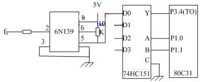 由图2看出,传感器频率信号是通过光电耦合器6N139耦合到74HC151的输入引脚D0。80C51的P1.0, P1.1输出控制码,选择D0--D3输入中的一路,用单片机的T0测信号频率。
