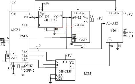 在80C51单片机中,外部I/O口是作为外部RAM来扩展的,选址的方法与扩充外部RAM的方法完全相同。本电路除了外部的RAM外,还有LCD显示器作为外部I/O器件,因此,只采用线选址方式是不够的,应采用译码选址方式。