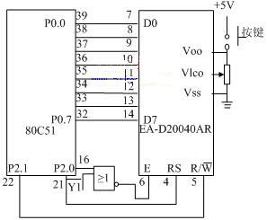 LCM点阵式液晶显示模块能显示的字符多,并且能显示汉字,因而在智能化测量控制仪表中得到了广泛的应用。本系统选用的是EPSON公司生产的EA-D20040AR点阵式液晶显示模块,它由TN型液晶显示器、CMOS驱动器和CMOS控制器组成,模块内集成有字符发生器和数据存贮器,采用单±5V电源供电,内部有能显示96个ASCII字符和92个特殊字符的字库。EA-D20040AR与单片机80C51的接口电路如图4所示: