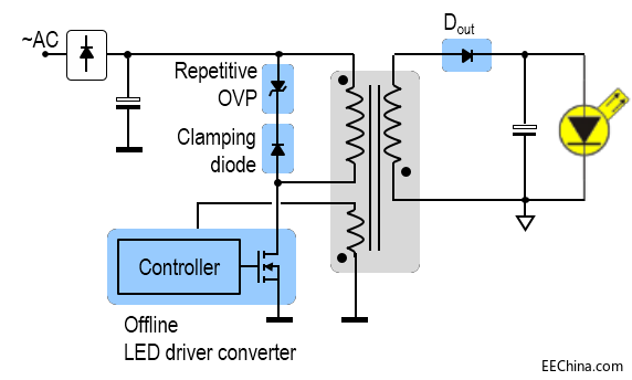 意法半导体高集成度离线转换器产品线很宽(每款产品都包含一个片上集成控制器和保护电路的功率MOSFET),最高输出功率15W,击穿电压800 V,能够管理市场上主流驱动拓扑,例如, 降压、升/降压和反激式拓扑。在这些产品中,专用离线LED驱动转换器,例如,HVLED805、HVLED807PF、HVLED815PF,具有高功率因数和一次侧恒流/恒压稳压(PSR-CC/CV)功能,如图1所示,因为电路二次侧无需稳压芯片和光耦,所以系统成本较低。此外,VIPerPlus系列Viper*5、 VIPer*6、VIPer*7、VIPer*8、VIPer0P和VIPer01离线转换器也适合驱动LED。