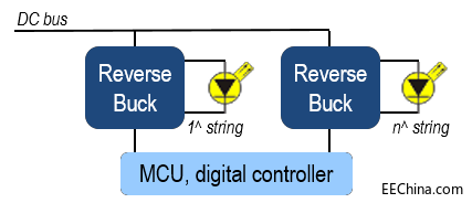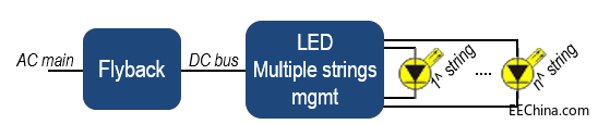 多灯带电源架构由主电源(通常是反激式拓扑)和多灯带管理电路组成,主电源提供恒定的DC总线电压。架构如图3所示。