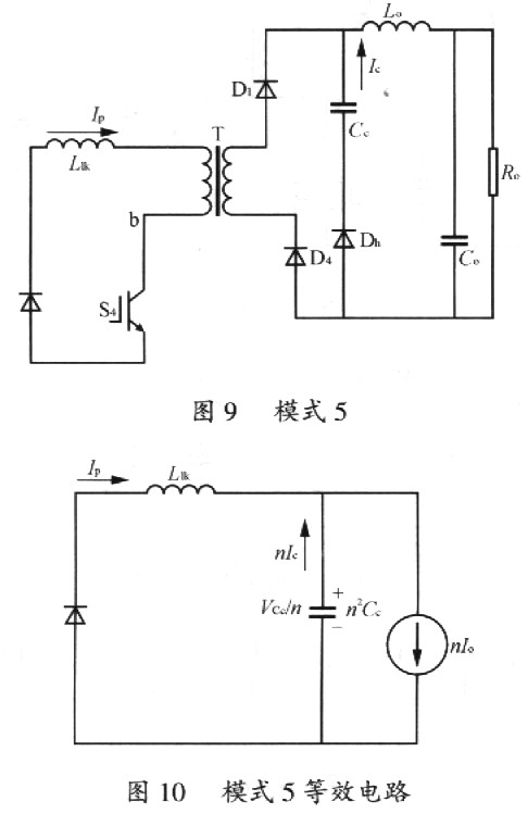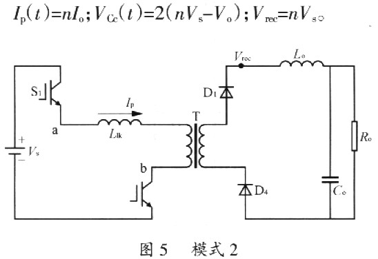 当cosωat=-1时,VCc(t)达到最大值,则sjmωat=o,Ip(t)=nIo,Ic(t)=0,二极管Dc关断,变压器副边电流流经D1、L。、Co、R。、D4和次边绕组,简化电路如图5所示。此时: