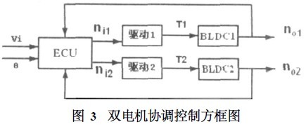 要判断驾驶员的驾驶意图是直驶还是转向,方向盘转角θ是一个重要参数。策略中引入方向盘自由行程角ε这样一个标志量,当|θ| > ε 时,车辆电控单元(ECU)认为驾驶意图为转向,否则为直驶。无论是直驶控制策略还是转向控制策略,其关键点还是通过对目标转速ni1和ni2的调节来实现对两侧电机的控制,从而达到对车体行走轨迹的操控。双电机协调控制方框图见图3。