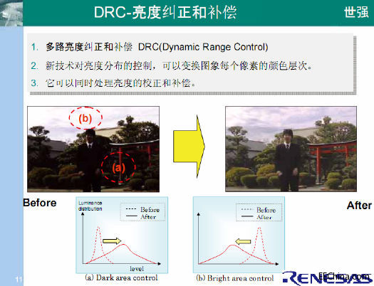 依托动态范围控制(DRC ,Dynamic Range Control)功能,即使是处理向阳处和背阴处这种亮度大不相同的多个视频图像,还能调整复合视频亮度,补偿过亮和过暗,以便驾驶员更清晰地看清图像显示。