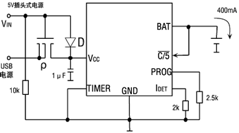 采用5V插头式电源或USB端口作电源充电的电路如图9所示。两种电源都可使用,若两种电源都接上,则5V插头式电源优先。5V插头式电源使10kΩ电阻通电,VGS≈0V,P管截止,USB端口不再供电。肖特基二极管D为阻塞二极管,它防止USB供电时,不会使10kΩ电阻通过电流,并且减小二极管的正向压降的损失。图中TIMER接地,IBAT<IDET时终止充电。若USB端口不能提供400mA电流,可将C/5悬空或接地。