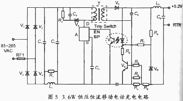不需要辅助电源的特点,使TinySwitch特别适于做移动电话充电器。由于TinySwitch总是由输入高压供电,因而不需要偏置绕组。图5显示了一个使用TNY254的5.2V、3.6W移动电话充电器电路,在市电输入电压范围内(85V至256V)提供恒定电压和电流输出。交流输入经V1~V4、C1~C2整流滤波,产生与TYN254内高压MOSFET串联的高压直流总线。电感L1与C1和C2一起构成?型滤波器。电阻R1用于衰减电感L1的谐振。TNY254的低工作频率(44kHz)使其可以采用如上述简单的?型滤波器与一个电容C8组合来满足传导EMI标准。V6、C4和R2组成箝位电路,将TinySwitch漏极引脚关断电压尖峰限制在安全值范围内。次级绕组经V5和C5整流滤波提供5.2V输出。L2和C6一起提供辅助滤波。输出电压由光耦V7的发光二极管的管压降(约1V)和齐纳二极管V9的电压之和确定。电阻R8提供齐纳二级管的偏置电流来改善电压容差。用晶体管V8的UBE来检测通过电流检测电阻R4上的电压,R3是一个基准电流限制电阻。当R4上的压降超过晶体管V8的UBE时V8导通,并驱动光耦V7来取代环路控制。R6产生额外的压降,使得控制环路工作输出降至0V。由于输出短路,R4和R6上的压降足以保持V8和V7电路工作。电阻R7和R9限制了在输出短路时,由R4和R6上的压降产生的通过V9流入V8的正向电流。