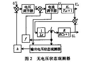 功率开关放大器和输出L-C滤波器是DC/DC电源的基本组成部分,无电压传感器DC/DC电源在此基础上,利用文献[2]的结果实现反馈,并增加电流调节器和电压调节器,如图2所示,提高电源的稳定性和动态响应特性.