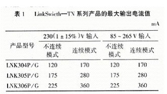 5)保护功能完善。芯片内部有短路后自动重启动的保护电路、开环故障检测及保护电路、限流保护电路和具有滞后特性的过热保护电路。 在交流固定输入230(1±15%)V或交流宽范围输入(亦称通用输入)时,LinkSwitch—TN的最大输出电流值见表1。