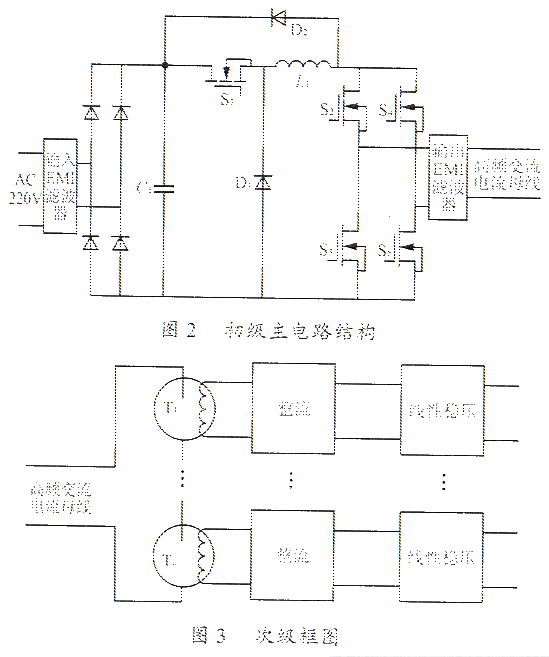 新型多路输出高压隔离电源的一次结构主电路如图2所示。从图2不难看出,这种电源主要是由两级来实现,第一级为Buck DC/DC变换,第二级为全桥逆变。新型多路隔离输出电源次级的主电路结构框图如图3所示。一次侧交流母线依次穿过所有环形磁芯,经过整流、线性稳压后,成为多路驱动电源。