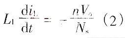 3)[t2,t3]阶段 S1关闭,S2及S5开通,电感L1放电,等效电路如图5(c)所示。可以得关系式(2),即
