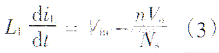 一般电源要实现高压隔离,都必须设计出能实现高压隔离的变压器。这种耐高压的变压器首先必须保证绝缘强度,另外,在线包结构工艺,装配工艺,绝缘处理等诸多方面都有严格要求。如果要做到各路输出之间的高压隔离,受到材料、温升、与其它参数的影响,变压器体积将会过大,成本很高。如果采用高频交流电流母线的技术,如图3所示,原边只须用一根高压电缆穿过普通的环形磁芯(即变压器原边匝数只有一匝),就可以实现能量的传输和高压隔离,而高压隔离的等级随着电缆绝缘水平的升高而提高。因此,这种基于高频交流母线技术的供电系统就不需要设计专用耐高压的变压器。采用交流母线传输功率和隔离的方案,由于原边匝数只有一匝,激磁电感比较小,如式(9)所示。