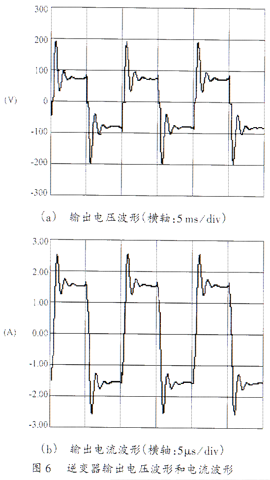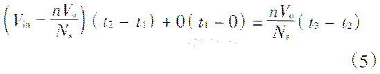 从上面的分析可以知,在一个逆变器的开关周期内虽然有6种工作状态,但是,在后半周期内,逆变器的等效负载电压改变了方向,因此,图5(d)、(e)、(f)过程分别等效图5(a)、(b)、(c)。这样便可得电感的伏秒关系式(5),即