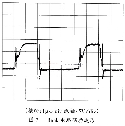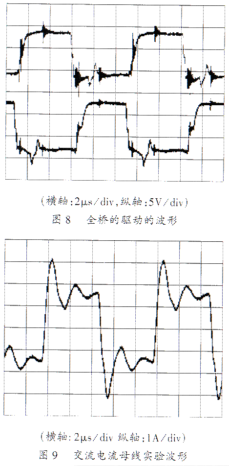 图6是逆变器输出的电压波形和电流仿真波形。图7为Buck电路的驱动实验波形,从图7不难看出Buck变换器的占空比近似为0.4。图8为全桥逆变电路的驱动实验波形。图9为交流母线电流实验波形。从图9不难看出电感电流近似为1.5A。