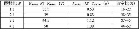 其中:VSW (MAX) 为开关管最大电压应力。根据电路仿真,得出如表1所示的在不同变压器匝数比情况下,开关电压应力和输出电流能力。