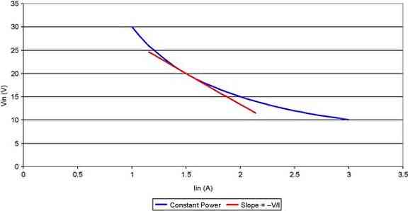电压-电流线呈现出一定的斜率,其从本质上定义了电源的动态阻抗。这根线的斜率等于负输入电压除以输入电流。也就是说,由 Pin = V·I,可以得出 V=Pin/I;并由此可得 dV/dI=–Pin/I2 或 dV/dI≈–V/I。