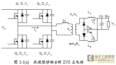 传统的PWM DC/DC 移相全桥零电压软开关(ZVS)变换器利用变压器的漏感或/和原边串联电感和开关管的外接或/和寄生电容之间的谐振来实现零电压软开关,由于超前桥臂和滞后桥臂实现零电压软开关ZVS的条件不尽相同,导致了滞后桥臂实现零电压软开关ZVS的难度比超前桥臂要大得多;输出整流二极管换流时关断的二极管反向恢复会引起次级较大的电压尖峰;并且还存在较为严重的副边占空比丢失的情况。为了解决这些问题,以下提出了一种改进型的电路拓扑结构。