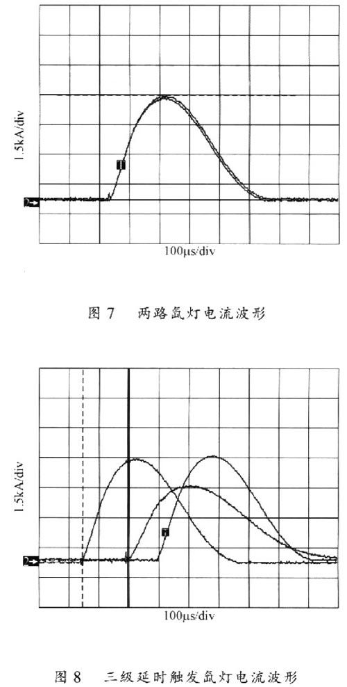 100J强激光脉冲能源系统进行了一系列的调试实验。图7给出了一级两路氙灯负载放电的电流波形(采用Rogowsky线圈测量),两路电流分配均匀,波形基本重合。图8给出了三级氙灯负载放电的电流波形,三级氙灯放电回路按设定的延迟时间准确触发,延迟时间可以按要求准确调整。能源系统输出脉冲能量、电流幅值和波形均满足100J激光放大系统要求,系统工作稳定、可靠。