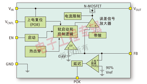 图2所示是AX661x产品的原理图。该系列产品设计皆采用双电源架构来设计,电源VIN为用作输出转换来源,VCNTL为内部电路所使用的电源。再搭配使用N-MOSFET驱动,AX661x参考电位设计在0.8伏特,因此最低的可输出电压可达0.8伏特。它的输出电压具有1毫秒的软启动时间,可大幅降低开机时的突波电流。输入电压VIN、VCNTL皆具有过低电压侦测功能,当输入电压过低时会停止输出,可避免IC端与后方系统端的功能误动作。此外,为了确保后端系统所得电压正确无误,其具有POWER-OK脚位,用以提供后端系统警示。本身IC内部具备90欧姆的放电电阻,在输出关闭时会启用,具有自我快速放电功能。过电流保护电路,会在电流超过安全范围时予以限制。若当输出处于短路状态时,另将启动输出周期性开启机制,不让输出电流持续处于高压差且限电流值的状态(因为此时的发热功率最大)直到短路状态被解除。在持续重载或大跨压下,热量会持续累积,温度会上升,当到达最高温容许值时,会启动过温保护功能,此时会关闭输出,以避免IC烧毁,直到温度回到回复点,此时输出将会被重启。