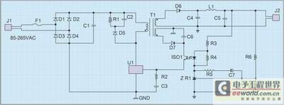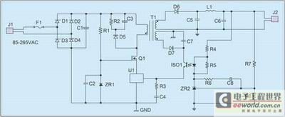 图1为一种典型全集成架构。U1为用于全输入电压范围的高电压IC,该芯片在一个硅片上集成了高电压开关晶体管与控制逻辑,而没有采用目前流行的将两块裸片置于一个封装中的混合设计。图1中反馈信号通过光耦ISO1加于IC的Bias/FB(偏压/反馈)端,变压器的偏置线圈为IC提供电源。