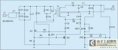 图2为一种典型分立实现方案。分立高压晶体管最初由直流总线通过R1偏置并由ZR1箝位,当晶体管栅极电压达到导通阀值时,Q1打开。当通过检流电阻的漏电流达到预定值时,被关断的控制晶体管Q2被偏置电压打开,将Q1关断。Q1关断后,储存在变压器中的能量即传递到次级线圈及偏置线圈,并通过C3与 R6构成的RC网络给Q1栅极加一个正偏压,RC网络的时间常数决定关断时间。反馈信号通过光耦取得并加于Q2的基极,以对基极电流进行调整。基极电流调整导致对导通时间间隔的调整,进而实现对输出电压的调整。