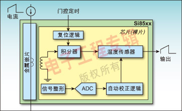图1中,传感器由一个金属嵌片和封装在一个小型(4x4x1mm)QFN封装中的硅裸片组成。嵌片和片上精选线圈一起构成一个耦合电感器,因此流经嵌片的交流电流感应出的电压等于电流的一阶导数(即v=Lm di/dt)。然后片上的信号处理电路执行一个有限积分运算,产生一个与流经嵌片的电流成正比的实时信号。该信号再经过片上的温度补偿器和增益级电路进一步调整。最后的结果是一个满刻度为2V、噪声非常低的温补电流信号。