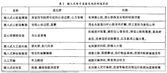 植入式医疗设备可分为被动式和主动式两种。大多数被动式的植入式医疗设备是非电子产品,如隐形眼镜、心脏支架、人造瓣膜、人造关节等组织结构装置。主动式的植人式设备如植入式心脏除颇器和心脏起搏器等各种激励系统,需要能量供给才能代替或提高某个器官的功能,或者治疗某种疾病。目前,植入式心脏除颇器和心脏起搏器这类装置维持着上百万心脏病患者的生命。其它激励系统也被用于治疗各式问题.如小便失禁以及慢性疼痛之类的疾病,深度脑激励设备也用于治疗诸如癫痛症、痉挛性震颇和帕金森综合症等疾病。虽然这些产品目前的应用规模不算大,但肯定会在不久的将来获得更广泛的运用。表1列举了部分植入式电子设备的功能以及它们的适应症。