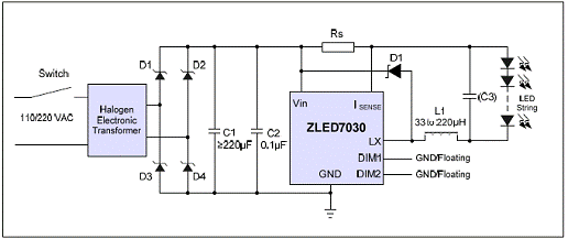 图3.采用卤钨灯电子变压器的ZLED7330应用电路