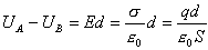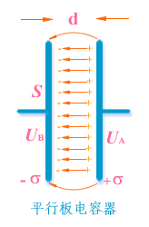 ,两板的内表面之间相距为d,并使板面的线度远大于两板的内表面的 间距(右下图)。令板A带正电,板B带等量的负电。由于板面线度远大于两板的间距,所以除边 缘部分以外,两板间的电场可以认为是均匀的,而且电场局限于两板之间。现在先不考虑介质的影响即认为两板间为真空或充满空气。根据上一章所导出的平行的无 限大均匀带电平面的电场强度公式,两极板间均匀电场的场强大小为