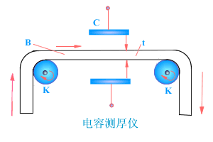的变化。根据这一原理所制成的电容式传感器,可用来测量诸如位移、液面高 度、压强和流量等非电学量。例如,右图所示的电容测厚仪,可用来测量塑料带子等的厚度。