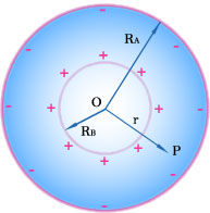 均匀分布的。外球壳的外表面上的正电荷可用接地法消除掉。两球壳之间的 电场具有球对称性,可用有介质时的高斯定理求出这电场,它和单独由内球激发的电场相同,即