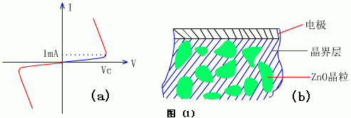 ZnO压敏电阻实际上是一种伏安特性呈非线性的敏感元件,在正常电压条件下,这相当于一只小电容器,而当电路出现过电压时,它的内阻急剧下降并迅速导通,其工作电流增加几个数量级,从而有效地保护了电路中的其它元器件不致过压而损坏,它的伏安特性是对称的,如图(1)a 所示。这种元件是利用陶瓷工艺制成的,它的内部微观结构如图(1)b 所示。微观结构中包括氧化锌晶粒以及晶粒周围的晶界层。氧化锌晶粒的电阻率很低,而晶界层的电阻率却很高,相接触的两个晶粒之间形成了一个相当于齐纳二极管的势垒,这就是一压敏电阻单元,每个单元击穿电压大约为3.5V,如果将许多的这种单元加以串联和并联就构成了压敏电阻的基体。串联的单元越多,其击穿电压就超高,基片的横截面积越大,其通流容量也越大。压敏电阻在工作时,每个压敏电阻单元都在承受浪涌电能量,而不象齐纳二极管那样只是结区承受电功率,这就是压敏电阻为什么比齐纳二极管能承受大得多的电能量的原因。