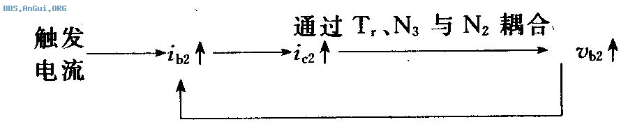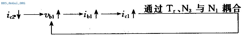 VT2集电极电流的增长趋势在磁环变压器的初级绕组N3上产生感应电动势,同时在其次级(N1、N2)也产生感应电动势,其极性是使各绕组上用?表示的同名端为正,从而使VT2的基极电位升高,基极电流、集电极电流进一步加大,即在电路中产生如下的连锁反应: