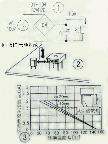 对发热元件的引脚不要剪得过短,应使其底部与印板间悬空;同时加大与周边元件的间隔.如图2。图3是整流桥堆(s2vB20)的引线长度与通过电流的关系曲线.可见引线越短.允许通过的电流越小。