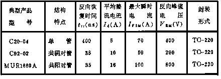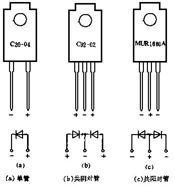 20A 以下的快恢复及超快恢复二极管大多采用TO-220封装形式。从内部结构看,可分成单管、对管(亦称双管)两种。对管内部包含两只快恢复二极管,根据两只二极管接法的不同,又有共阴对管、共阳对管之分。图2(a)是C 20-04型快恢复二极管(单管)的外形及内部结构。(b)图和(c)图分别是C92-02型(共阴对管)、MUR1680A型(共阳对管)超快恢复二极管的外形与构造。它们均采用TO-220塑料封装,主要技术指标见表1。