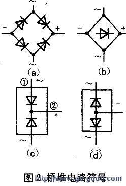 图2(a)所示是桥堆的电路符号;图2(b)所示是桥堆是电路符号的简化形式;图2(c)和图2(d)所示是两种半桥堆的电路符号,它们内部的二极管连接方式不同;一个是两只二极管的正极相连;另一个是两只二极管的负极相连。