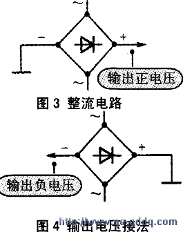 桥堆通常用来构成桥式整流电路(见图3)。它的两个引脚作为交流电压输入端,即标有“"”符号的两个引脚。
