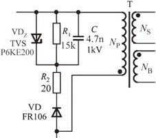 说明:这里采用快恢复二极管而不使用超快恢复二极管,目的是配合阻尼电阻R 2,将部分漏感能量传输到二次侧,以提高电源效率。
