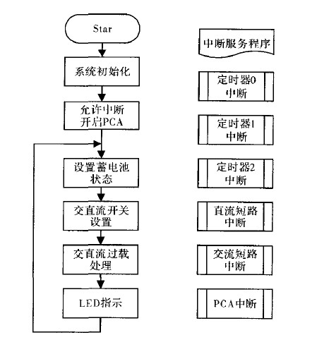 (4)直流和交流短路保护当检测到短路发生时,立即启动优先级最高的外中断程序,向SG3525的脚4和脚10送出短路保护信号,关断其输出。同时,切断为逆变器供电的继电器,使逆变器电源中断。