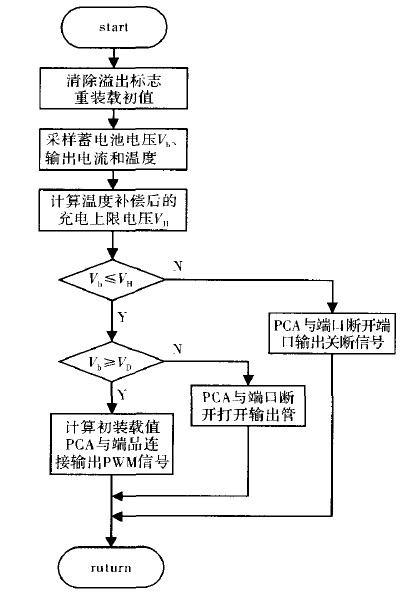 (1)蓄电池充电控制充电MOSFET的栅极由MCU的一个I/O口控制。当蓄电池电压低于直充阈值时,MCU跳过PCA,直接输出一个高电平信号打开充电MOSFET,使太阳板不间断地向蓄电池充电。蓄电池电压超过后,MCU接人PCA,改为PWM方式充电。充电的脉宽随着蓄电池电压的升高而逐渐变窄。达到充电上限后,再次跳过PCA,输出一个低电平,完全关断充电。