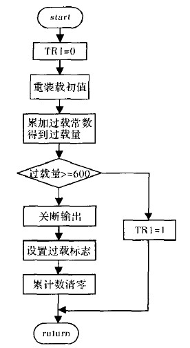 直流过载和交流过载的保护程序基本上是相同的。以直流过载保护为例,它是由图6所示的直流过载保护程序和图7所示的定时器l中断程序配合实现的。每当检测出过载,程序立即启动定时器1,同时根据过载的程度,为一个“过载常数”赋值。定时器1每次溢出即进入中断,对过载常数进行累加以得到过载量。一旦过载量达到设定的阈值,MCU就会关断输出。