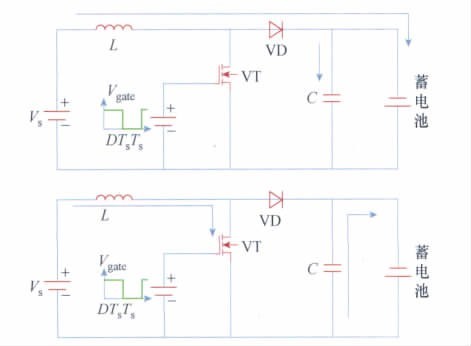 光伏控制器在设计时通常采用升压电路,产生比光伏电池板两端更高的电压,以利于向蓄电池充电,同时也克服了传统电路中防倒灌二极管将蓄电池电压钳位在12 V 的弊端。但当光照不足时,若要使蓄电池能够继续充电,该控制电路会导致光伏电池的工作点脱离最大功率输出点,会使得光伏路灯系统的发电效率下降。因此设计控制系统时需预设弱光段的阈值,以实现在弱光下能通过超级电容缓冲来保证蓄电池正常充电的目的。