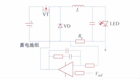 LED 的控制电路比较简单,直流驱动即可,且其寿命可达10 万h。但是,驱动电流的大小在很大程度上影响着LED 的寿命,如果电流太大,则可能引起LED 光衰现象严重,且寿命减少。故必须合理设计其驱动电路,如图3 所示为用BUCK电路实现的LED 恒流控制电路。