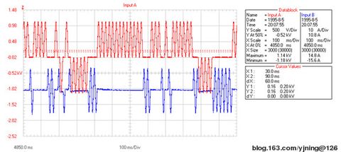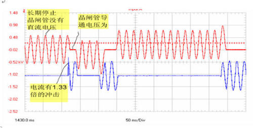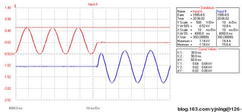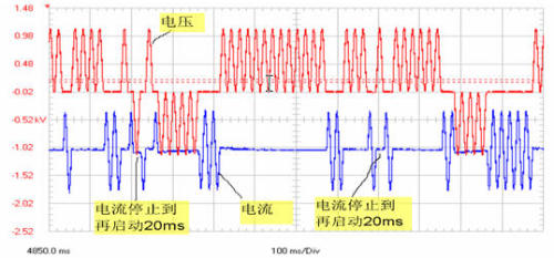 横轴为时间200ms/格,纵轴电压500V/格,电流20A/格。可控硅工作时两端的电压零,线路中有电流,停止时可控硅两端有电压,电流为零。在连续动作中,电流没有冲击。