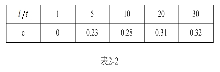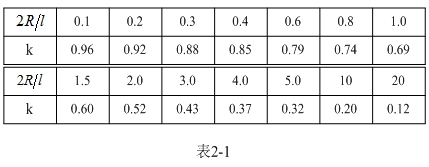 【说明】上式是用来计算多层线圈绕组、截面为圆形的空心线圈的电感计算公式。长冈系数k可查阅表2-1,系数c可查阅表2-2。当线圈内部有磁芯时,有磁芯线圈的电感是空心线圈电感的μr 倍, μr是磁芯的相对导磁率。相对导磁率的测试方法很简单,只需把有磁芯的线圈和空心线圈分别进行测试,通过对比即可求出相对导磁率的大小。