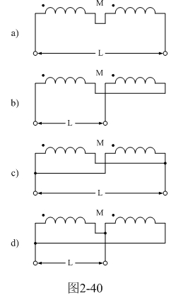 【说明】互感M有正负,图2-40-a和图2-40-c的接法互感M为正,图2-40-b和图2-40-d的接法互感M为负。两个线圈之间的互感M为: