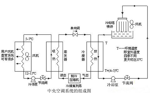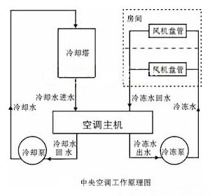 它主要由制冷机、冷却水循环系统、冷冻水循环系统、风机盘管系统和散热水塔组成。其工作原理如下图所示: