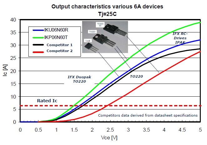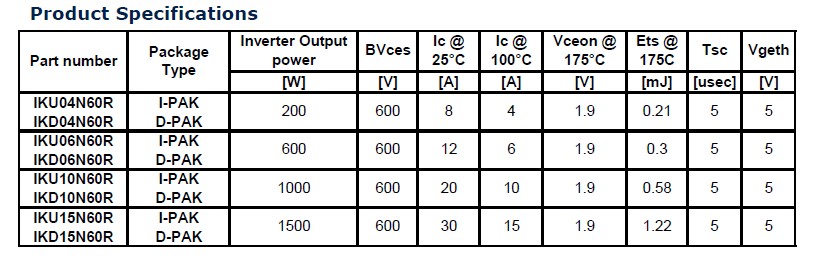 目前这种逆向导通型IGBT有两种封装形势,一种是IPAK封装,另外是DPAK封装,电流有4安、6安、10安和15安四个等级。它主要的特点就是有非常低的价格,还有节省空间。半导体器件它的成本主要取决于两个方面,一个是它的晶圆,减少晶圆的数量,从两个晶圆减少到一个晶圆可以减少成本。另外的话,这种T0220的封装还有这种D2PARK封装可以减少成IPARK封装和DPARK封装,同时减少封装的成本,减少了封装的话同样会减少它的空间,但是减少了晶圆的话会不会对它的性能造成影响?首先我们来看一下,同样它有一个非常低的饱和导通压降,对它的性能丝毫没有任何影响。另外可以通过改变门级驱动电阻,在宽范围调节它的开通和关断的时间,有一个非常好的EMI效果,非常平滑的开关波形,5us的短路保护能力,最高结温可以达到175度。这个是这种逆向导通型IGBT的主要参数,这个是它的击穿电压,这个是它的电流,这是175度饱和导通压降,这是开关的能力,这是短路保护的能力,这是它的门级驱动电压,基本上对于一个200W的产品可以选择4安的IGBT,600W的话可以选择一个6安的,1000W可以选择一个10安的,1500W的可以选择15W的产品。