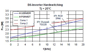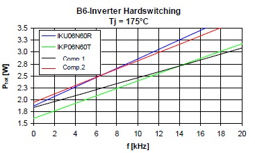 这个是25度损耗的时候,这个是175度损耗的时候,可以看到蓝色的这根线,基本上它的损耗跟这个TO220封装产品相差并不是很大。这个是在基于刚才基础上做的一个损耗分析,首先频率在4K赫兹的时候可以看到,这个浅蓝色的就是二极管的开关损耗,这个是二极管的导通损耗,这个是IGBT的开关损耗,这个是IGBT的导通损耗。可以看到在4K的情况下导通损耗这一部分和这一部分是占了绝对支配地位的。所以对于一个低频应用来说减少它的饱和导通压降对于IGBT是相当的重要,当它的频率升高的时候,它的开